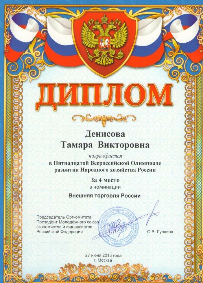 Денисова Тамара Викторовна – 4 место в Пятнадцатой Всероссийской Олимпиаде развития народного хозяйства России (номинация «Внешняя торговля России»)