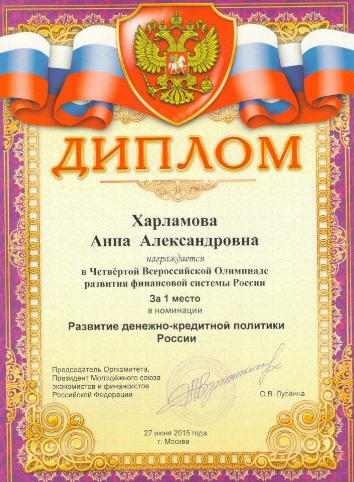 Харламова Анна Александровна – 1 место в Четвертой Всероссийской Олимпиаде развития финансовой системы России (номинация «Развитие денежно-кредитной политики России»)